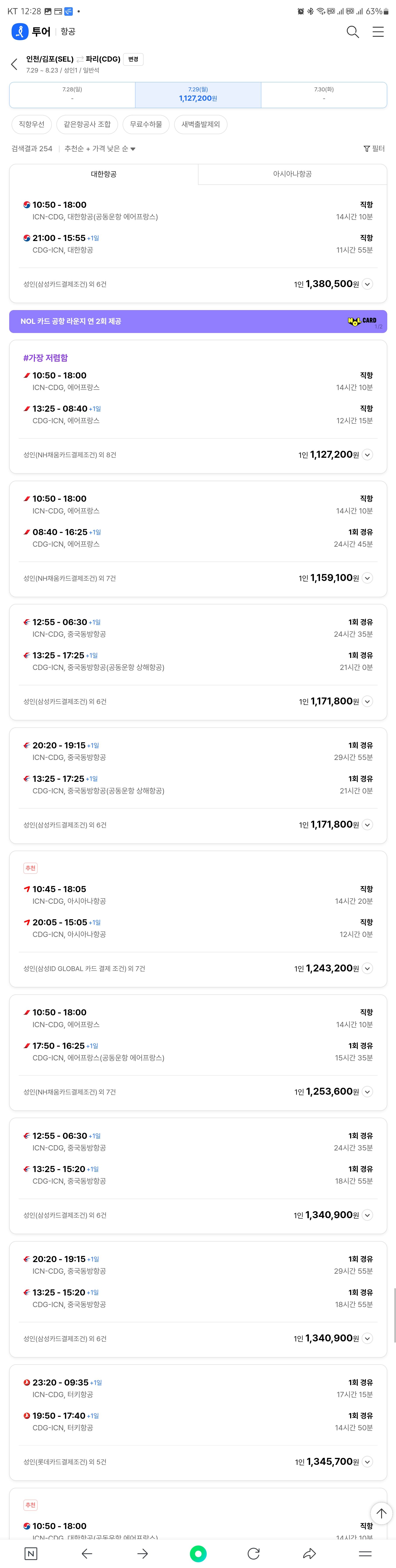 아래 리스트에서 대한항공을 타고 인천에서 파리를 가는 금액이 부담스럽다면 차라리 에어프랑스와 아시아나 항공 직항을 이용할 것 같다. ^^;