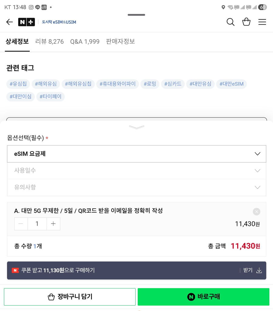 결제를 하고 여권을 주니 직원이 설정에 들어가서 이심을 세팅해주었다.