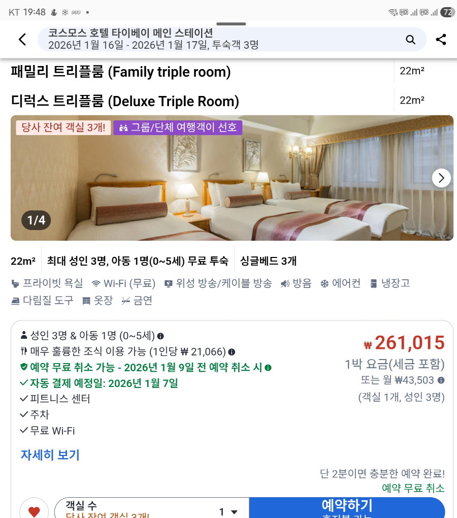 내가 코스모스 호텔 타이베이 메인스테이션에서 예약 한 방은 디럭스 트리플룸으로 보통 1박에 20만 중 후반대에서 주말에는 30만 원대까지 올라간다.